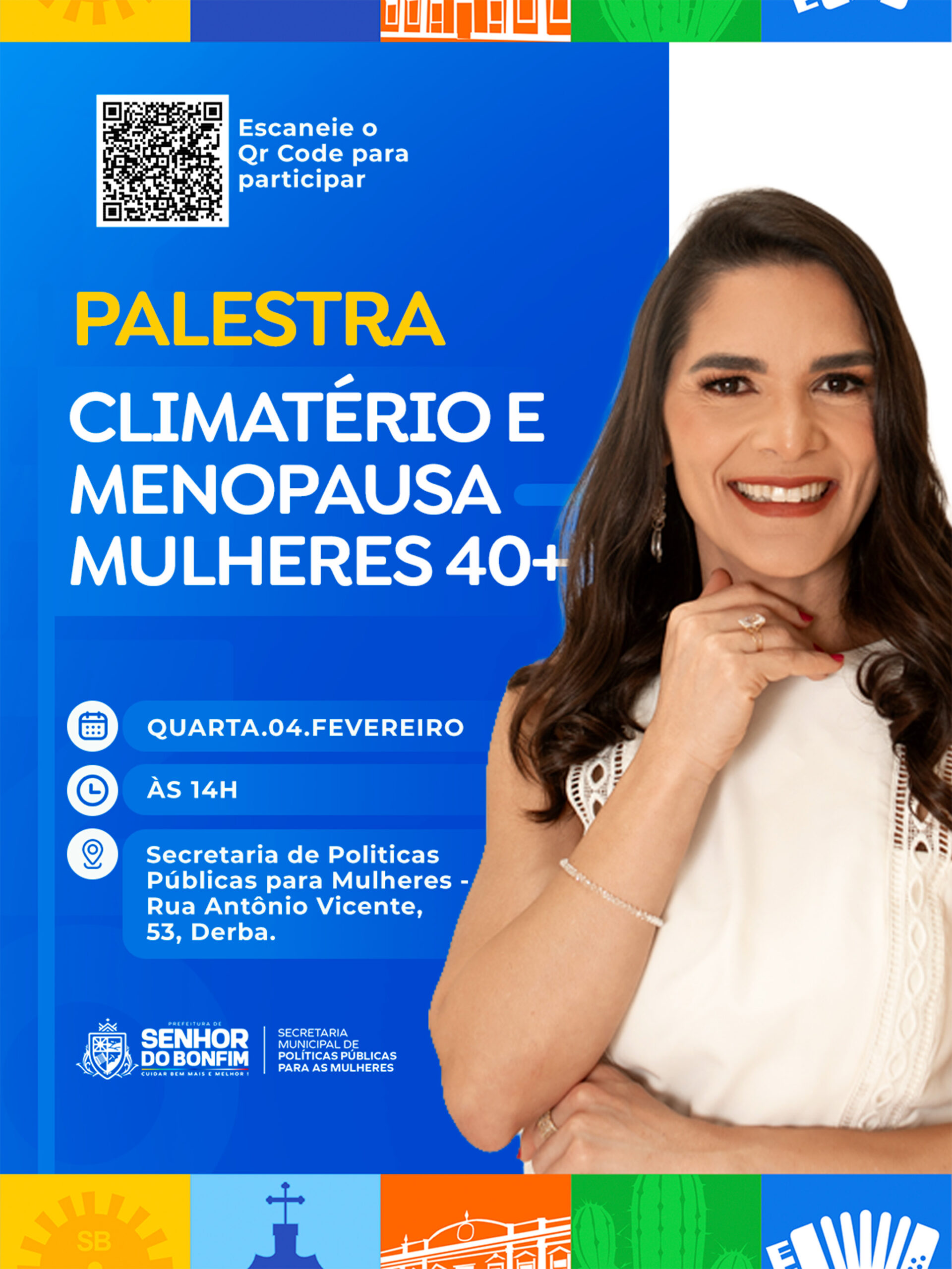 A Prefeitura de Senhor do Bonfim, por meio da Secretaria Municipal de Políticas Públicas para Mulheres, realiza na próxima quarta-feira (4), às 14h, a palestra “Climatério e Menopausa”.